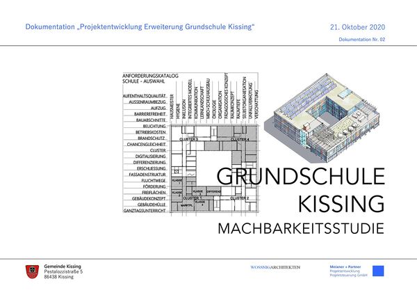 Für die Grundschule in Kissing wurde eine Machbarkeitsstudie über die Bestandsanlage bzgl. Anbau, Umbau und Neubau erstellt. Unter Einbeziehung eines Instituts für Statistik, das die demographische Entwicklung der Gemeinde abschätzte, wurden fünf denkbare Optionen entwickelt und bis zur umfangreichen Kostenschätzung ausgearbeitet, um der Gemeinde eine Entscheidungshilfe an die Hand zu geben. Als nächster Schritt sollte für dieses Projekt dann im Jahr 2021 ein VGV-Verfahren bzw. ein Architektenwettbewerb vorbereitet werden.